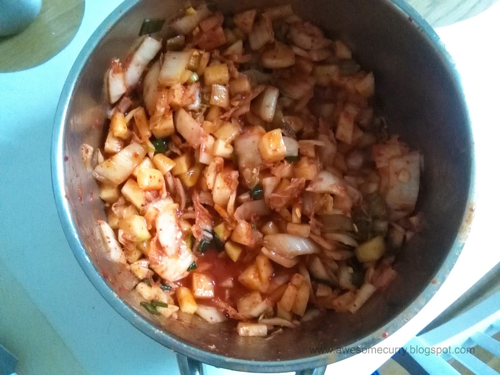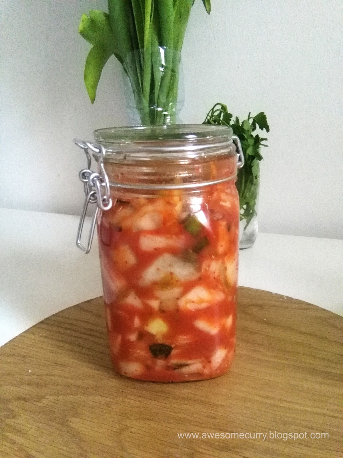 - Если вам удастся, вы можете купить в азиатском магазине готовую смесь для кимчи (иногда это гораздо проще, чем найти все составляющие по отдельности). В таком случае просто пропустите шаги, где описано приготовление чили-пасты, и после засолки капусты переходите сразу к этапу смешивания и раскладывания по банкам.