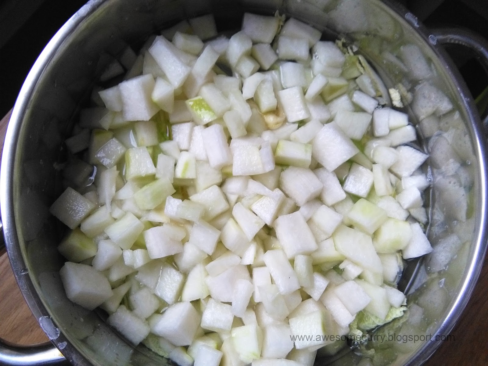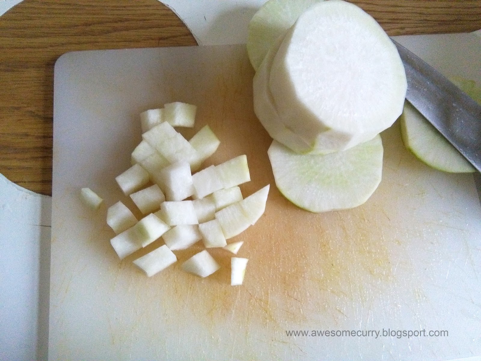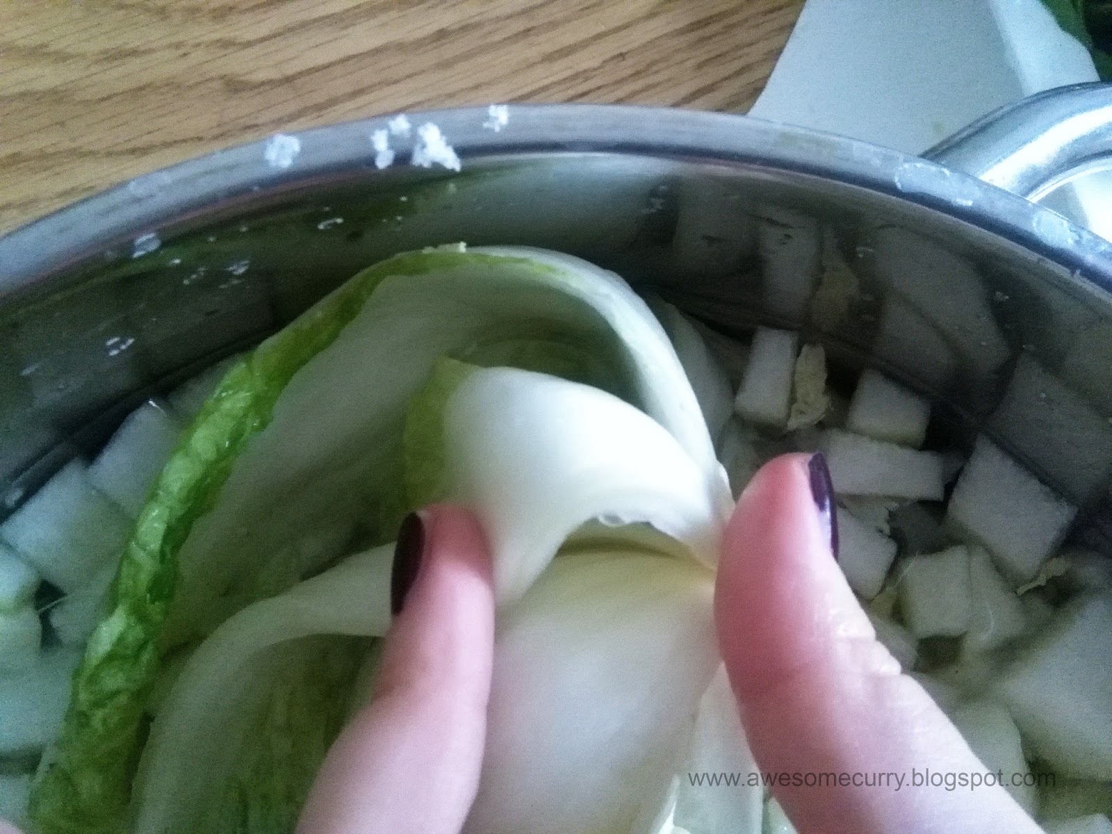 4. За минут тридцать до готовности капусты очищаем от корочки (если необходимо) и нарезаем небольшими кусочками (около 2 см) редис (моя редиска была просто огромных размеров, и я использовала только половину, вы можете регулировать количество по желанию) засыпаем его четырьмя чайными ложками соли и слегка массируем. Потом можно оставить его засаливаться отдельно в миске, а можно всыпать в кастрюлю к капусте, как сделала я.