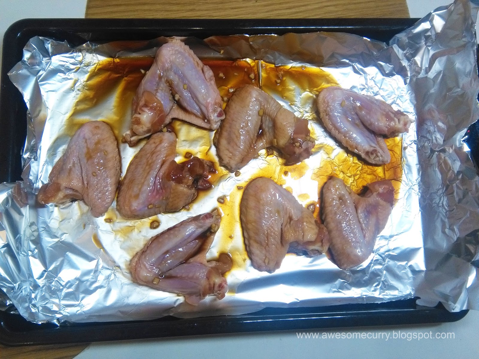 3. Разогреваем духовку до 180 градусов, складываем крылья на застеленный фольгой противень и отправляем внутрь. Оставим немного маринада для смазывания.