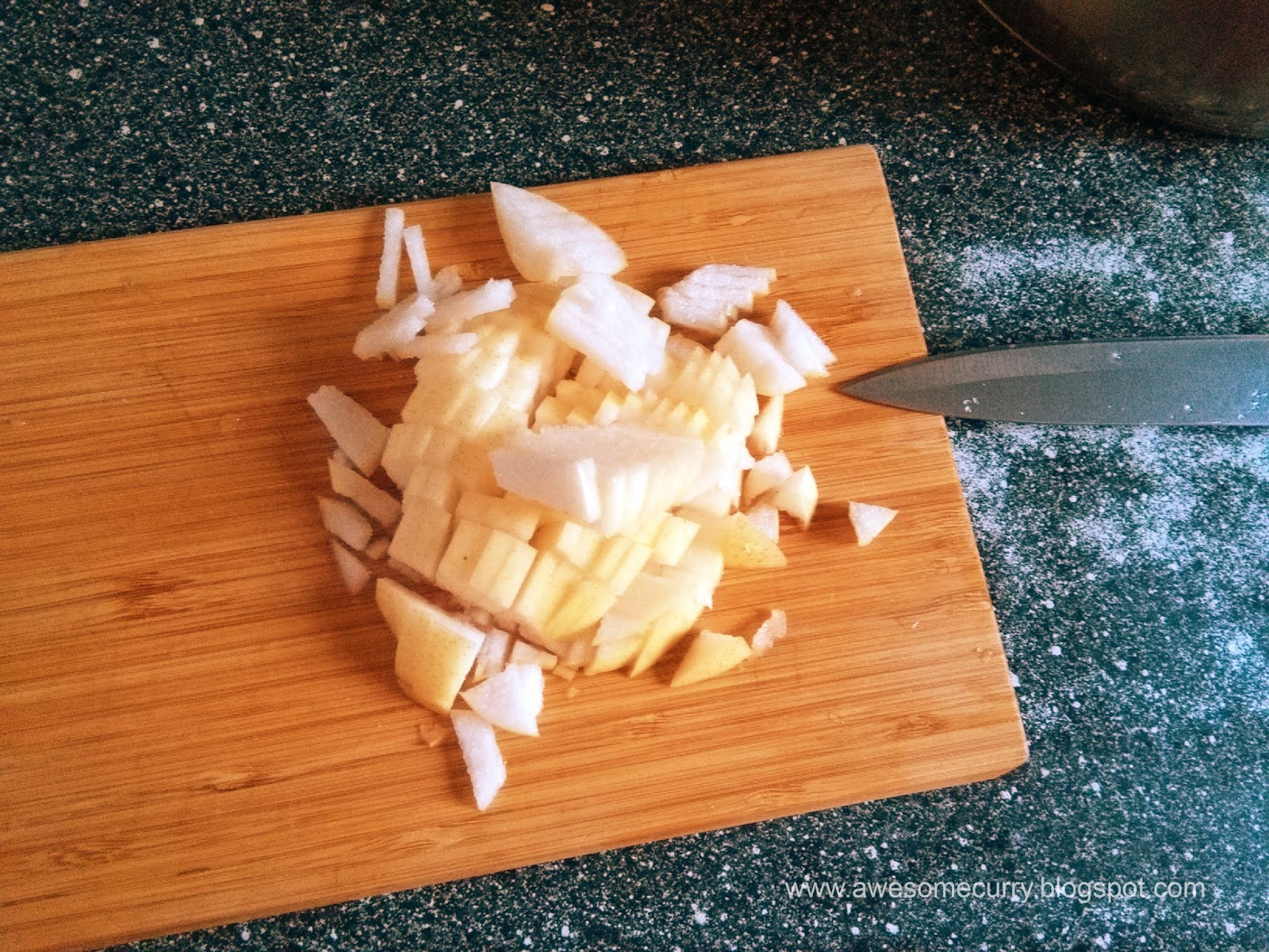 4.  Разрежьте грушу пополам и аккуратно вырежьте сердцевину, после чего нарежьте китайскую грушу небольшими кусочками и добавьте в маринад