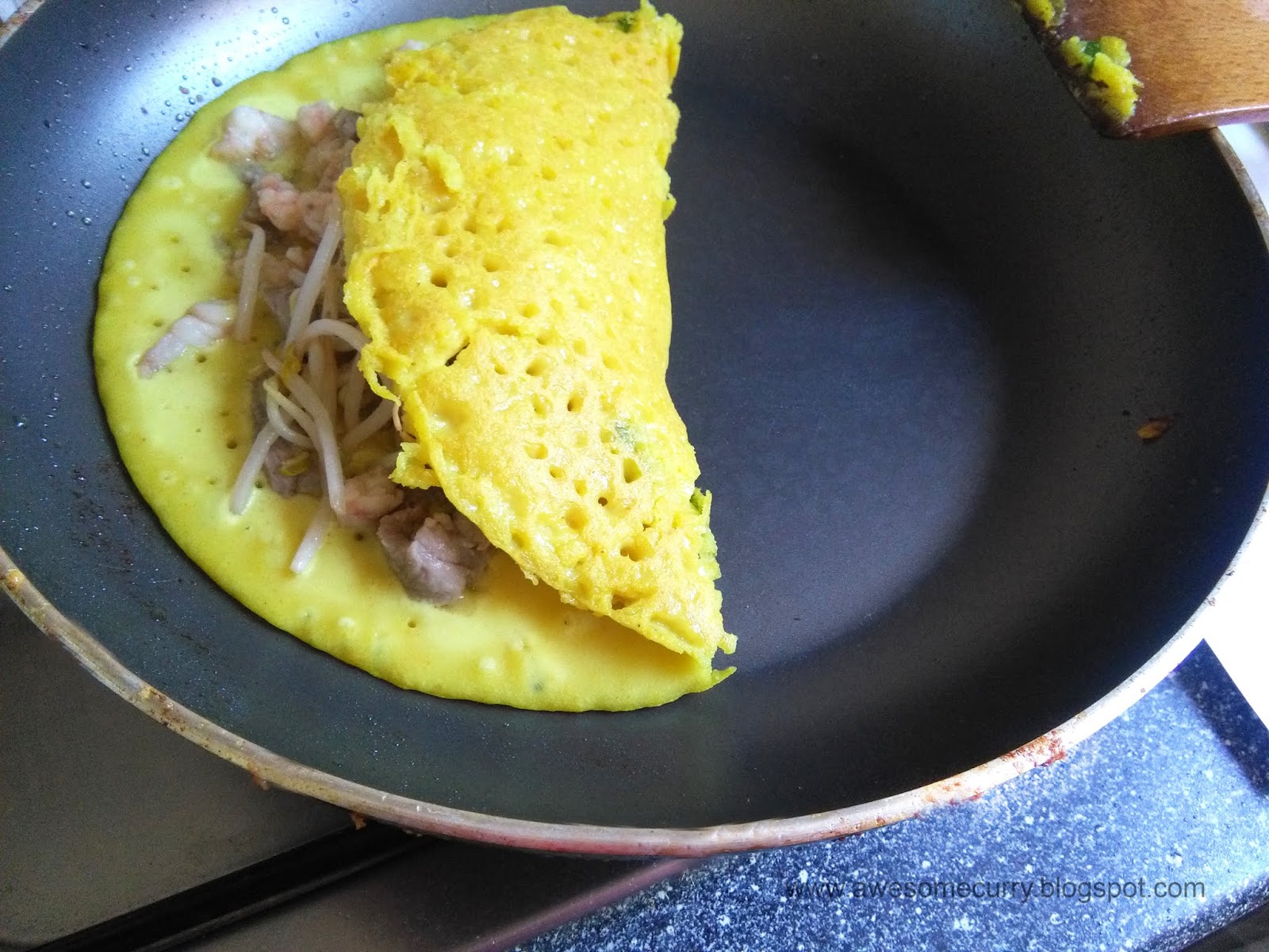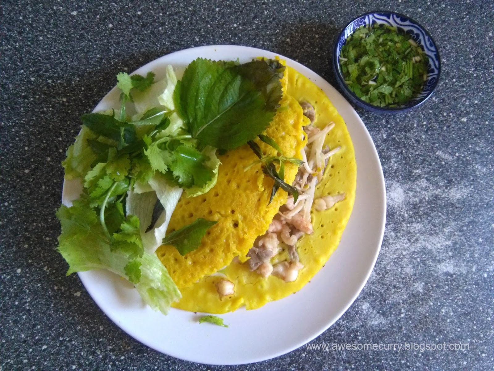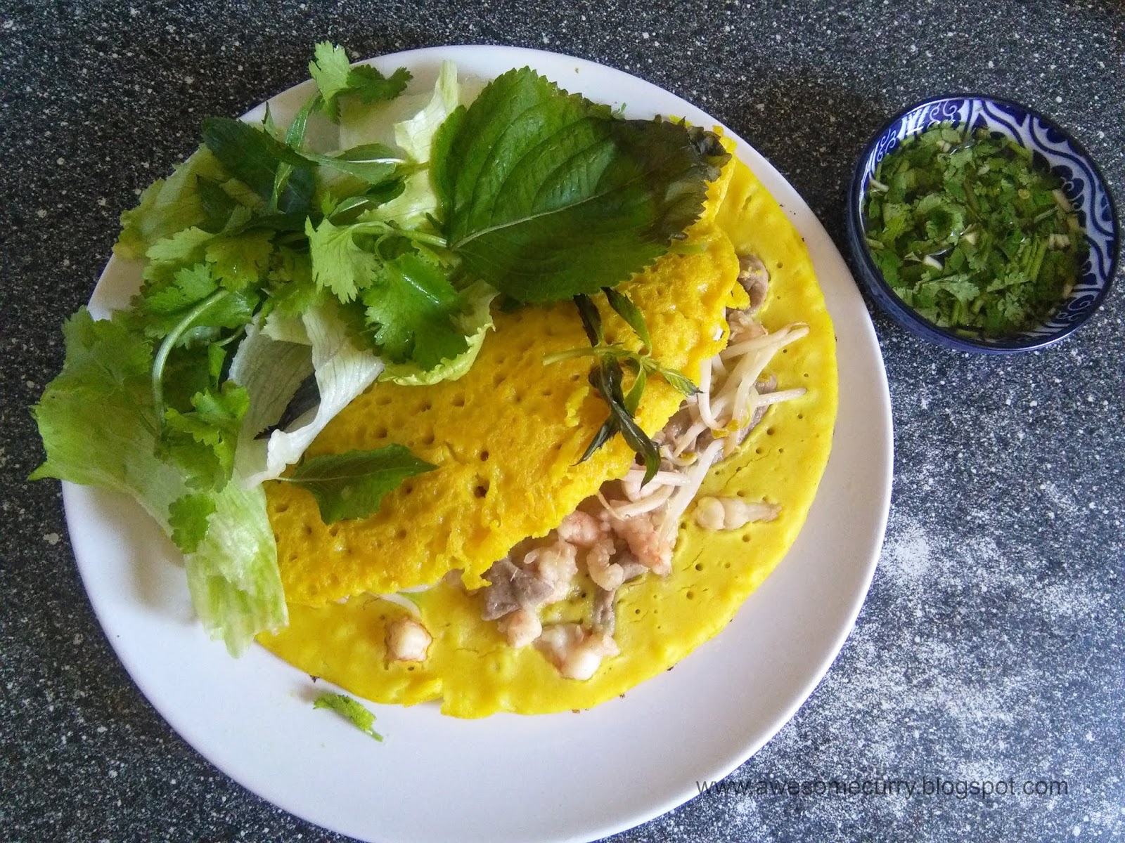 Сами по себе и блинчик и начинка, как и многое во Вьетнаме, имеют скорее пресный вкус. Поэтому не игнорируйте приготовление соуса, тем более, что готовится он просто (а рецепт тут же, в блоге). Блинчик нужно макать в дип при еде. Еще один вариант сделать блюдо ярче – предварительно замариновать мясо и креветки в чесноке с маслом.
