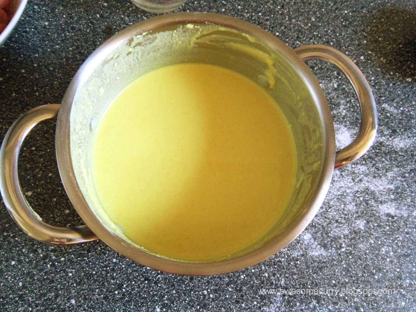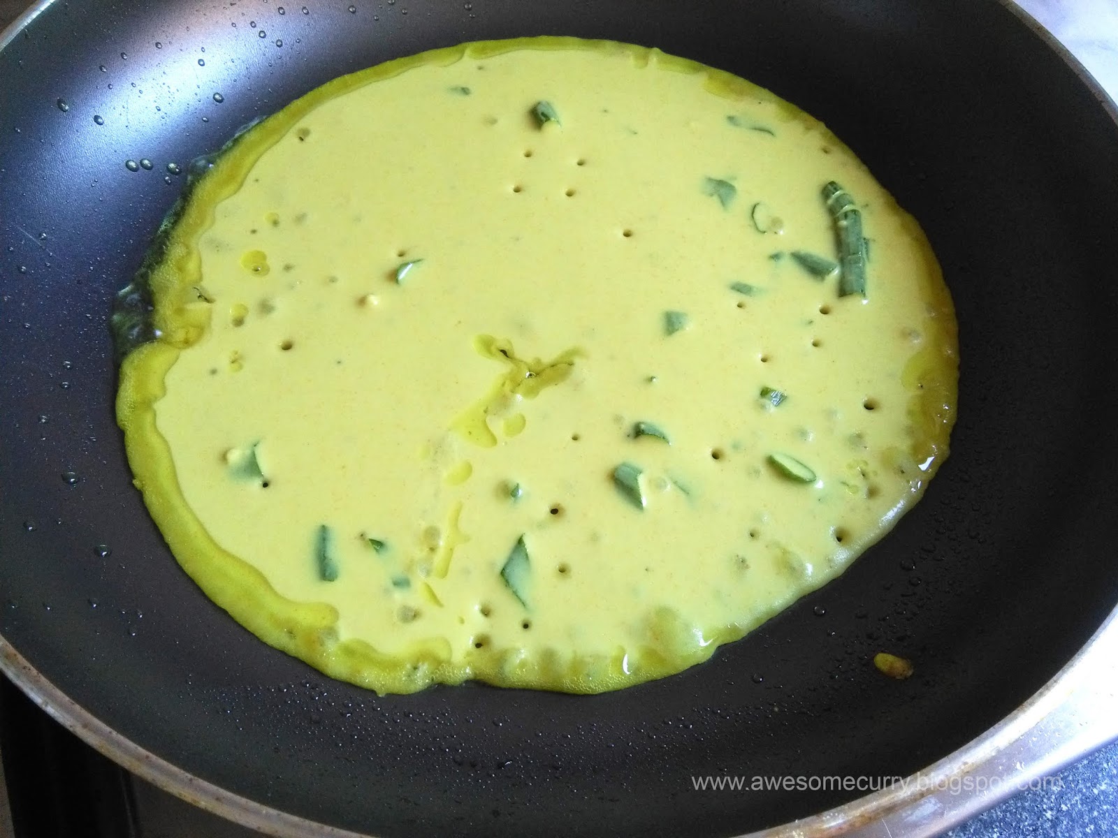 Если на сковороде будет не хватать масла, добавьте 0.5 чайной ложки. Сковороду хорошо разогрейте на сильном огне и вылейте немного теста. Сделайте круговое движение сковородой, чтобы тесто распределилось равномерно внутри.