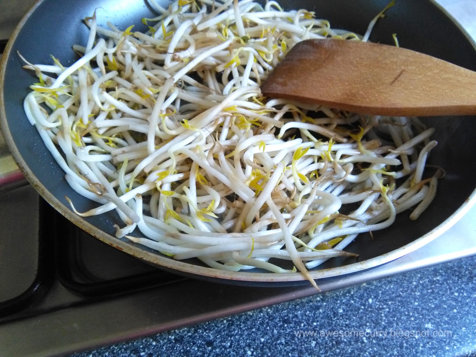 7. Возьмите небольшую сковородку, добавьте немного масла, положите ростки фасоли и готовьте на медленном огне в течение 2-3 минут, пока жидкость не выпарится. Снимите с огня и отложите в сторону.
