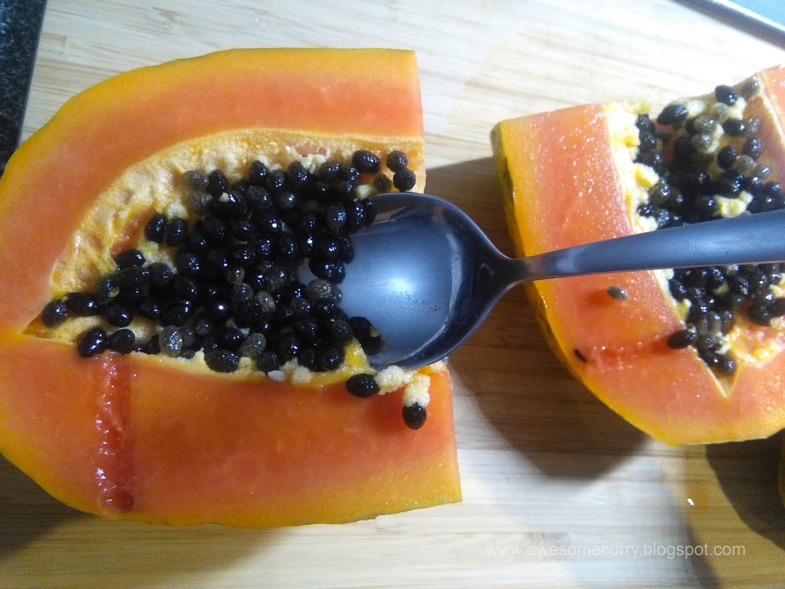 Найти “очень, очень, очень спелую” папайю в наших краях совсем непросто, да и не нужно. Она обладает теми же замечательными свойствами, что бананы или авокадо – прекрасно дозревает на полке в холодильнике или кухонном шкафчике. Достаточно выбрать подходящий фрукт и положить его в темное прохладное место на пару дней. И помните: чем лучше выглядит ваша папайя тем менее она, на самом деле, зрелая. По мере дозревания папайя сморщится, пожелтеет, покроется морщинками и пятнами и станет очень мягкой. Кожура спелой папайи очень легко повреждается, а мякоть так и сочится соком. Нарезка такого фрукта к сожалению дело не самое легкое, но при определенном подходе с ней вполне можно справиться, получив в награду сочный плод.
