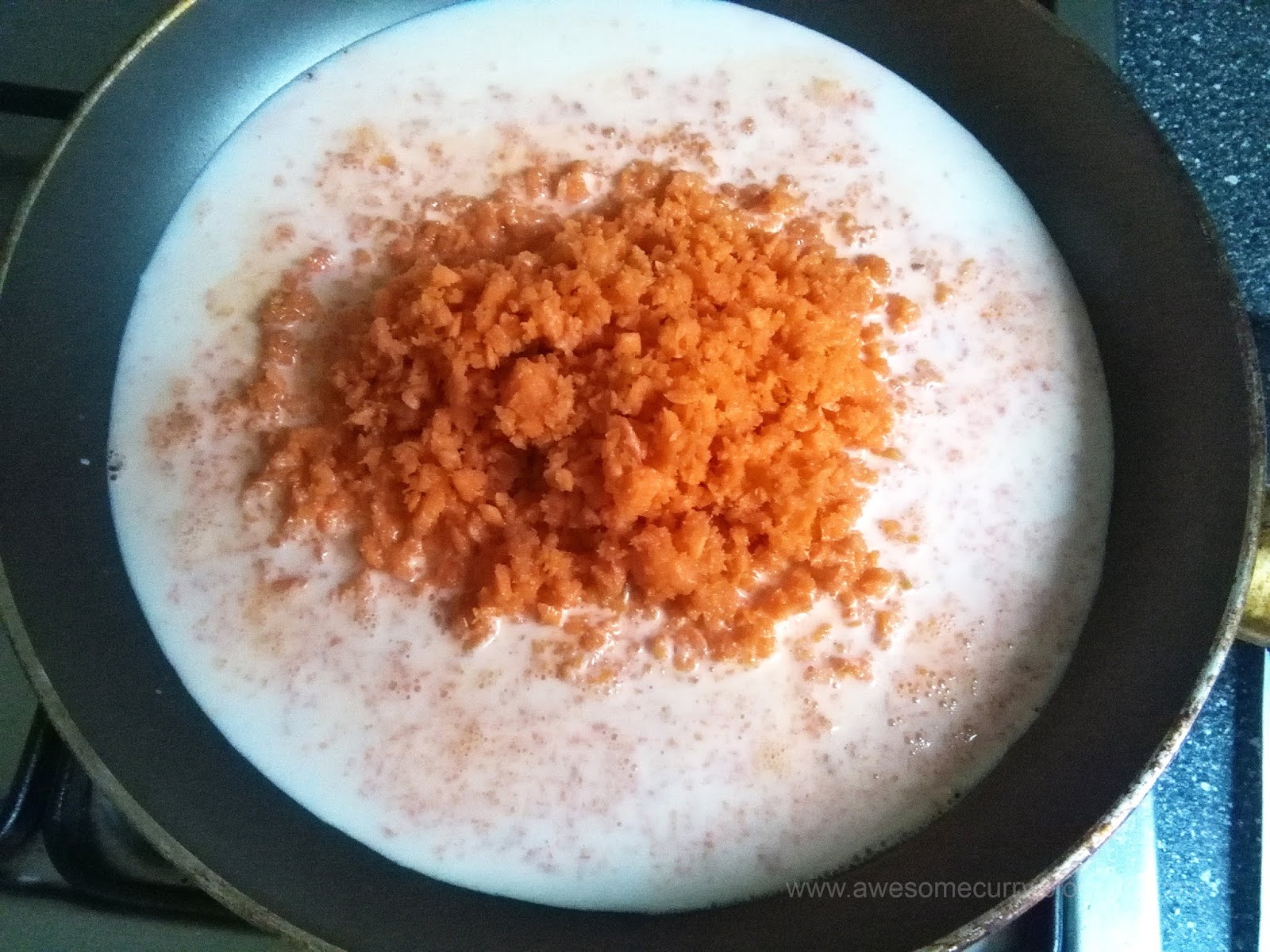 3. Доведите молоко до кипения на небольшом огне и продолжайте кипятить. Молоко будет выпариваться. Время от времени перемешивайте смесь, отскабливая с краев сковороды выпарившееся молоко и смешивая с морковью.