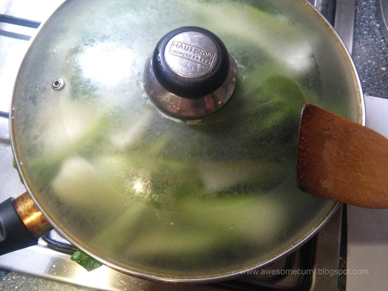 6. Добавьте в сковороду смесь рисового вина с водой, плотно накройте крышкой, уменьшите огонь и готовьте около 3-5 минут. Проверьте готовность капусты при помощи вилки – она должна легко входить в белую часть овоща. Сама капуста также должна выглядеть мягкой, “распаренной”.  В особенно толстых нижних белых частях стеблей может еще оставаться легкий хруст. По достижении готовности выньте капусту из сковороды.