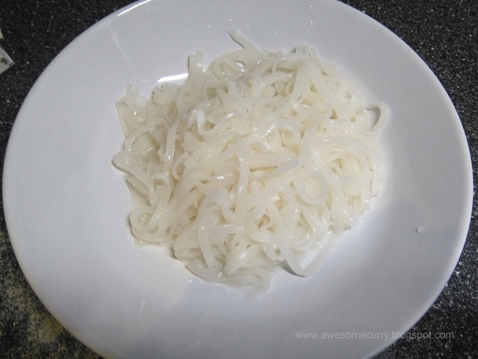 3. Подготовьте рисовую лапшу в соответствии с инструкцией на упаковке и промойте холодной водой. Технологии подготовки лапши отличаются от производителя к производителю очень сильно. Моя текущая лапша должна была быть отварена в течение шести минут. Общая технология такая: варим лапшу, пока та не станет мягкой и непрозрачной, после чего промываем холодной водой.