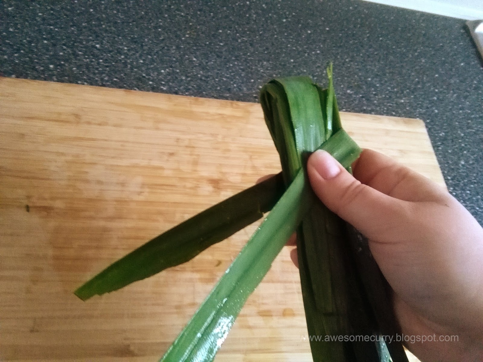 Ваша цель – сделать узел из нарезанных вдоль панданных листьев.