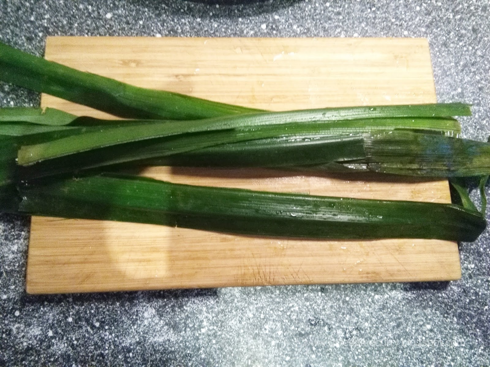 2. Разрезаем листья пандана пополам, моем, теперь разрезаем каждый лист вдоль на две части. Собираем все части вместе и завязываем в узел (можно помассировать его в руке, чтобы листья пустили сок).