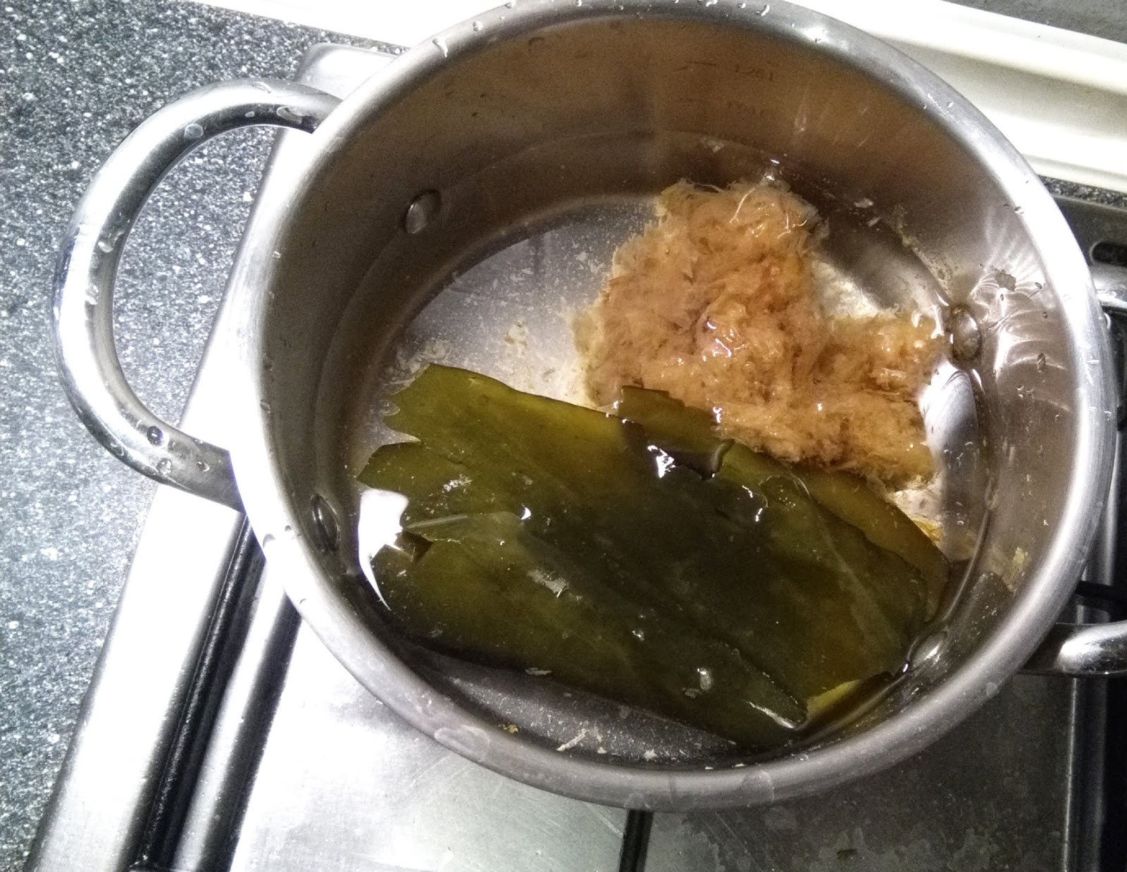 3. Теперь нагреем воду на медленном огне, и, как только вода начнет закипать (пойдут первые пузыри) – вынимаем комбу. Ее можно сохранить для приготовления Нибан Даси (второго бульона) либо использовать для других блюд, либо даже просто съесть.  Не оставляйте комбу кипеть в воде, иначе бульон станет склизким и горьковатым.