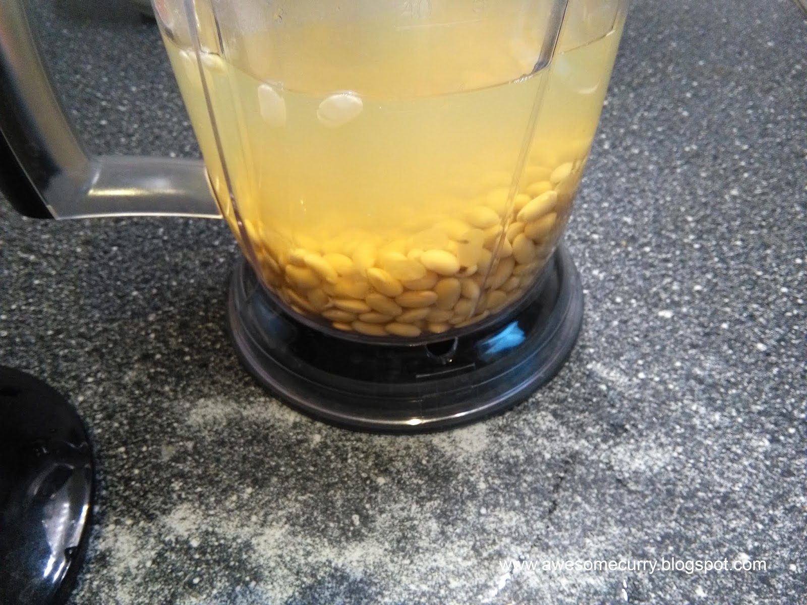 1. Возьмите ваши замоченные с вечера соевые бобы, аккуратно слейте с них воду. Поместите в небольшую кастрюльку вместе с 500 мл чистой воды и готовьте, не накрывая крышкой (иначе они будут жутко убегать) около 15 минут. Потом уменьшите огонь до почти минимума, накройте крышкой и готовьте еще 5 минут. Снимите с огня. Дайте слегка остыть.