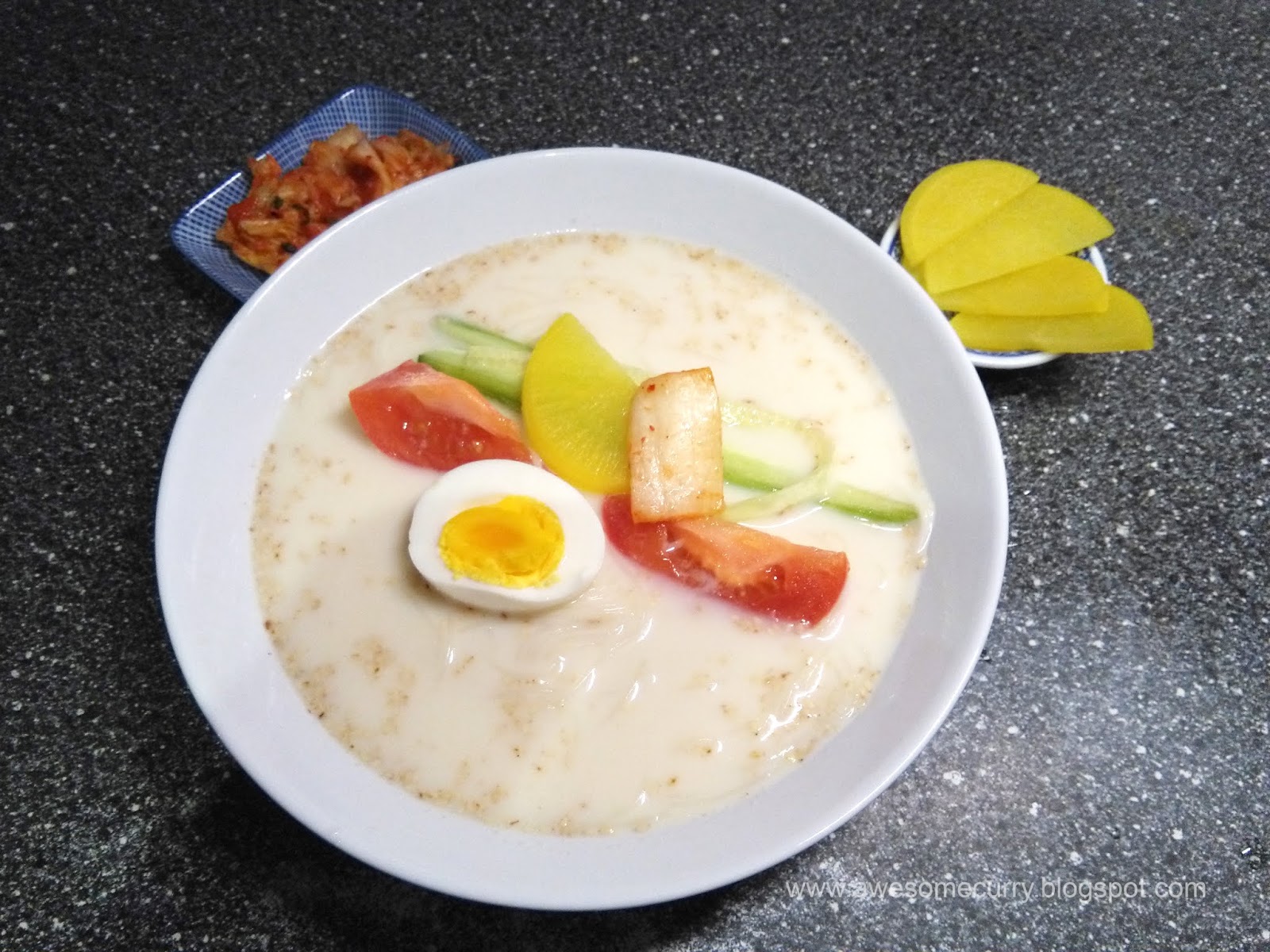 Звучит не очень-то привлекательно, правда? В самом деле, лапша конггуксу не самый канонический корейский продукт. Она не острая, в ней нету вкуса умами, она даже не обжигающе горячая, а наоборот – холодная. Именно поэтому она пользуется такой бешеной популярностью жарким корейским летом – это освежающее веганское (тут используется соевое молоко) блюдо, полное протеина, но при этом отлично охлаждающее организм. Лапша конггуксу легко идет в жаркую погоду, но при этом она очень питательная и белковая. Ее вкус не яркий, поэтому ее едят обязательно с кимчи и другими острыми закусками, а также часто – с огурцом и отварным яйцом. А особенно жарким летом бульон дополняют кубиками льда. Потому что холода никогда не бывает мало!