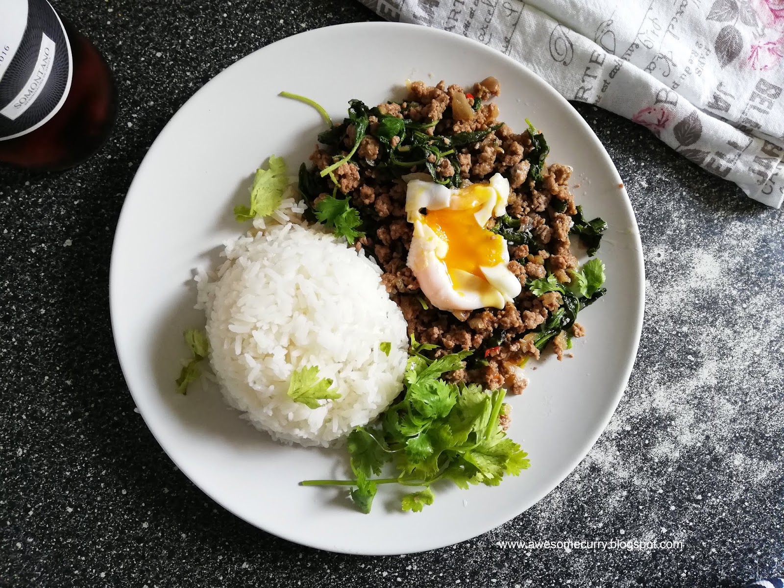Простая, каждодневная тайская еда – и такое вкусное экзотическое блюдо для нас – это жареное рубленое мясо – острое, чесночное и обильно приправленное тайским священным базиликом (holy basil), без которого оно немыслимо – простая комфортная еда, подходящая как для долгих зимних вечеров, так и для летних основательных перекусов, случающихся, к прискорбию, скорее поздно ночью, когда жара наконец спадает и появляется аппетит.