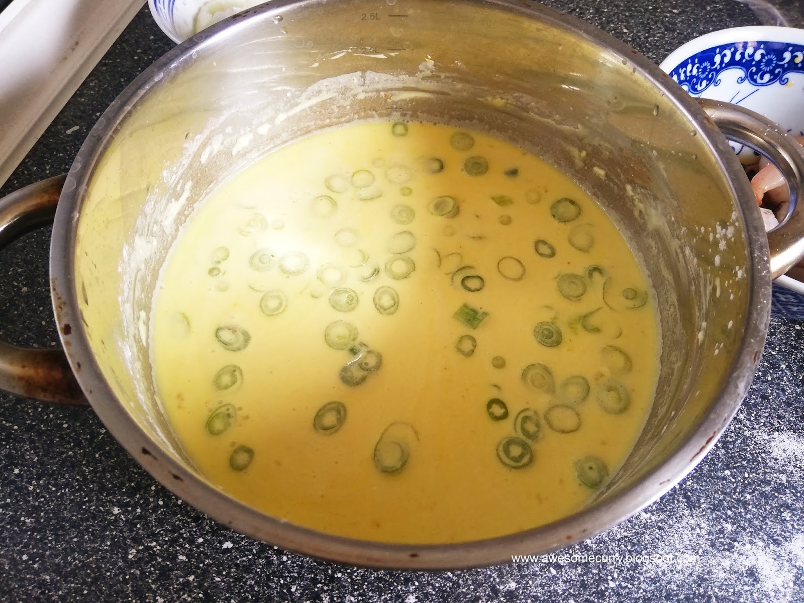 1. В большой мисочке при помощи венчика взбиваем вместе все ингредиенты из пакета со смесью для блинчиков, также дополнительную куркуму и рисовую муку, соль, кокосовое молоко, воду и яйцо, до тех пор, пока ингредиенты не перемешаются в однородное тесто. Добавьте мелко нарезанный зеленый лук, накройте тесто чем-нибудь и оставьте в покое как минимум на один час, а лучше на ночь – так тесто будет еще более хрустящим.
