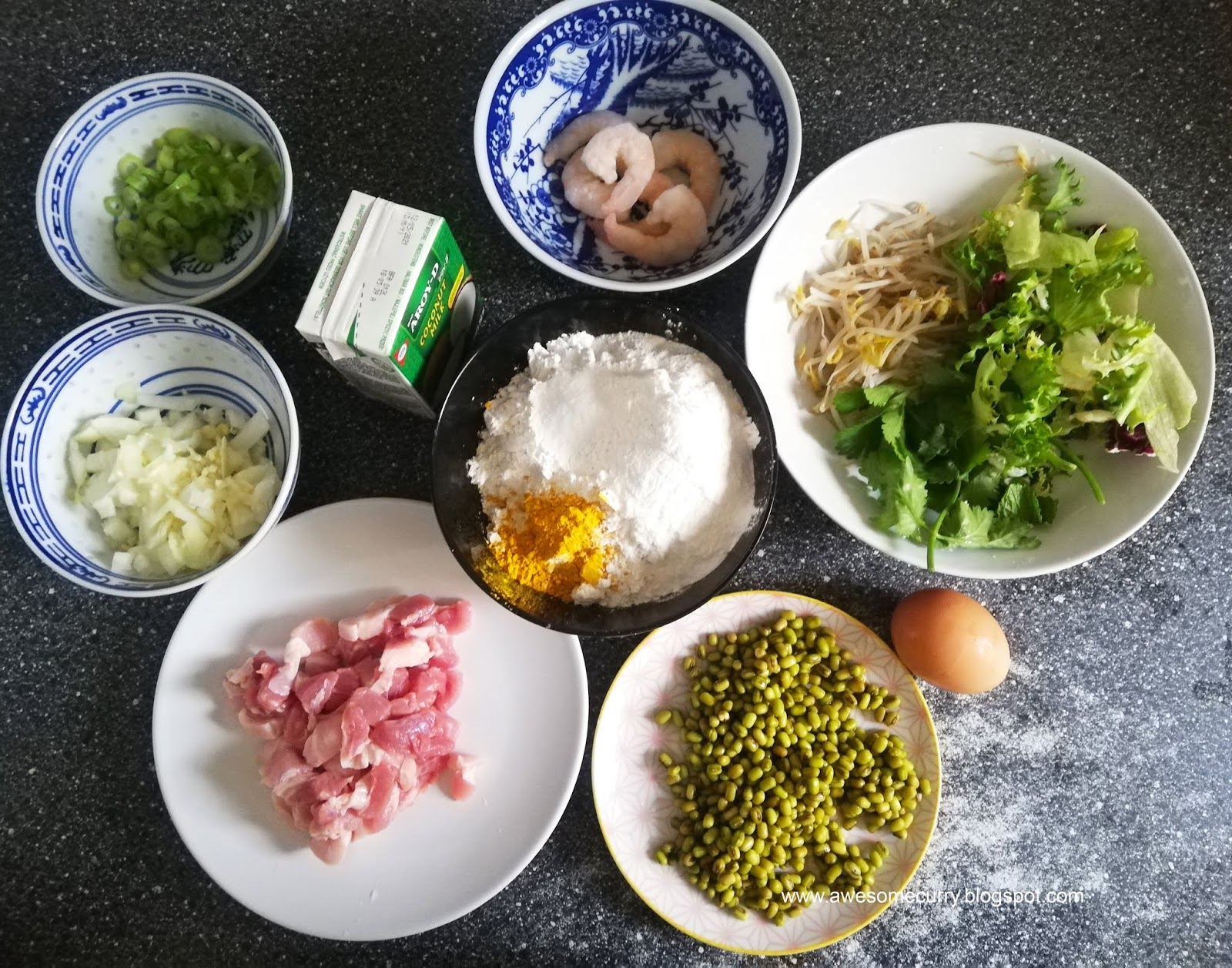 1. Мука для  Banh Xeo. Найти ее легко на любых рынках и лавках где обитают вьетнамцы или в азиатских магазинах, в том числе онлайн. Заменить можно, смешав рисовую муку с пшеничной в пропорции 3:1 и добавив чайную ложку куркумы, но учитывайте, что готовая смесь содержит и дополнительные ингредиенты, придающие в итоге тесту большую воздушность и хруст.