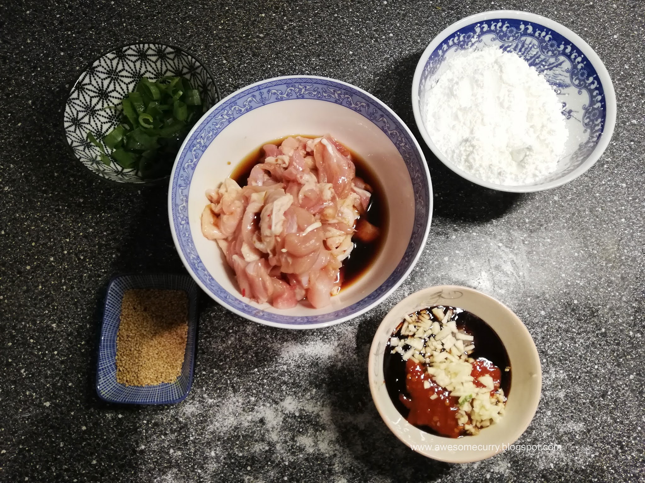 1. Нарежьте куриное мясо на небольшие кусочки, примерно 2*2 см. Добавьте соевый соус и рисовое вино, оставьте мариноваться примерно на полчаса