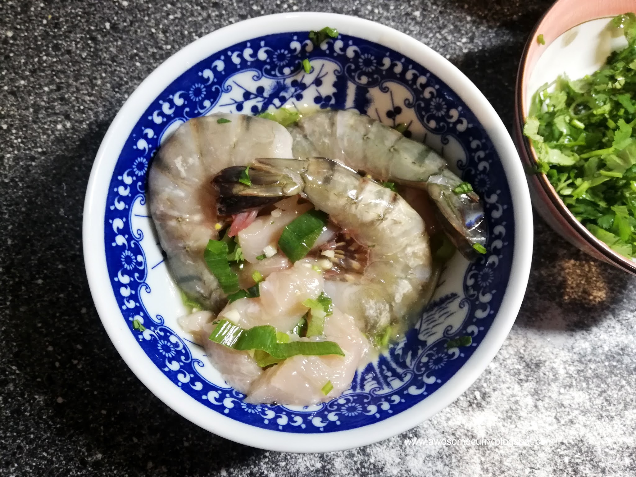 2. Замаринуйте курицу и креветки в примерно половине заправки, плюс добавьте грибной соевый соус, чеснок, лук и чайную ложку растительного масла. Оставьте примерно на час-два.