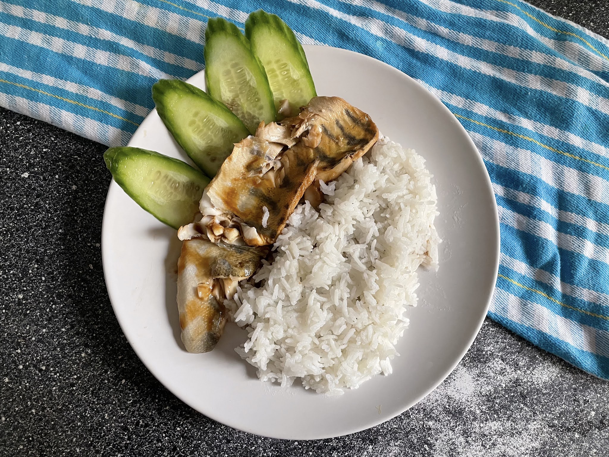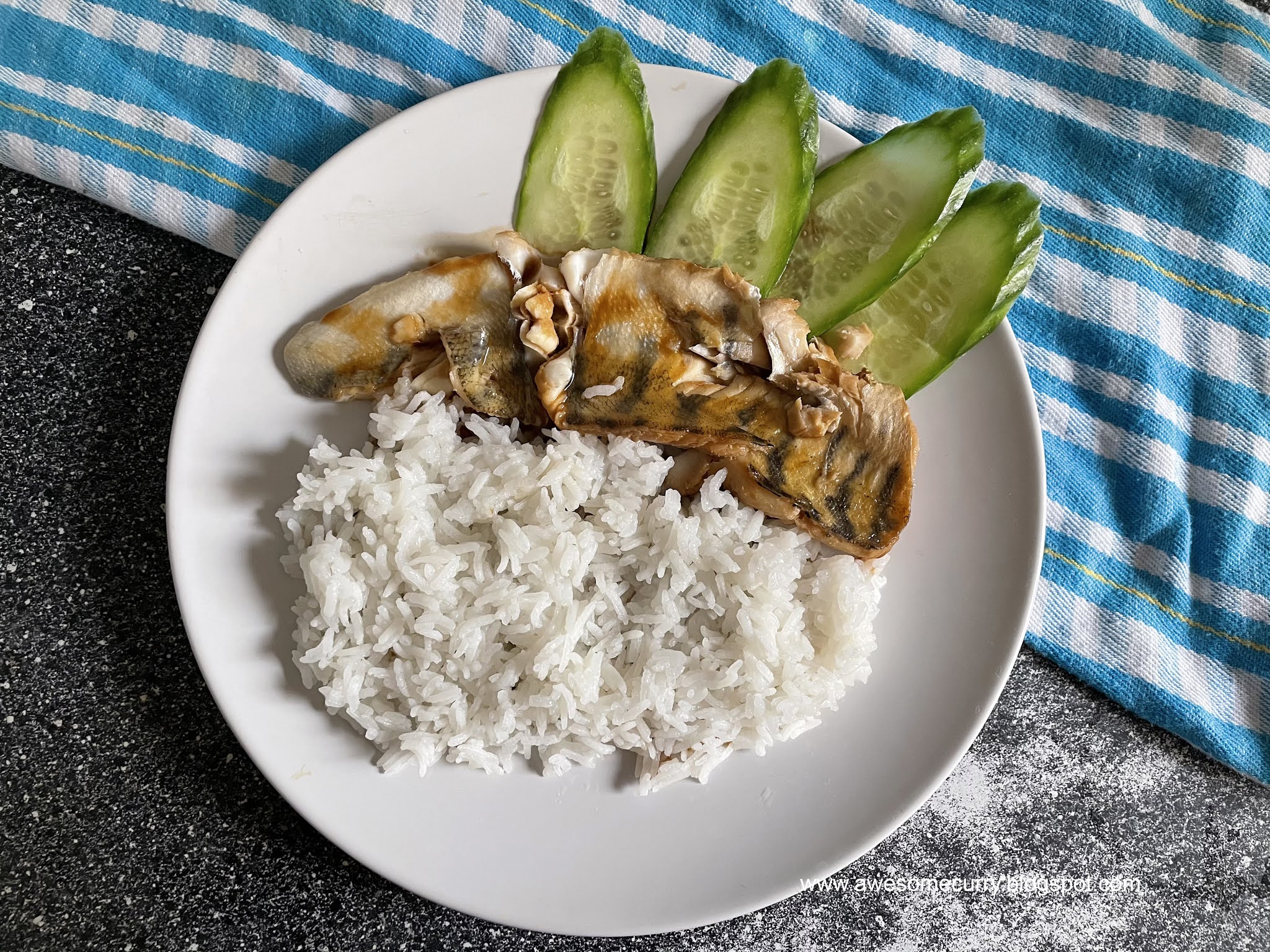 3. Подаем рыбу вместе с белым рисом и васаби, полив соусом, в котором она готовилась.