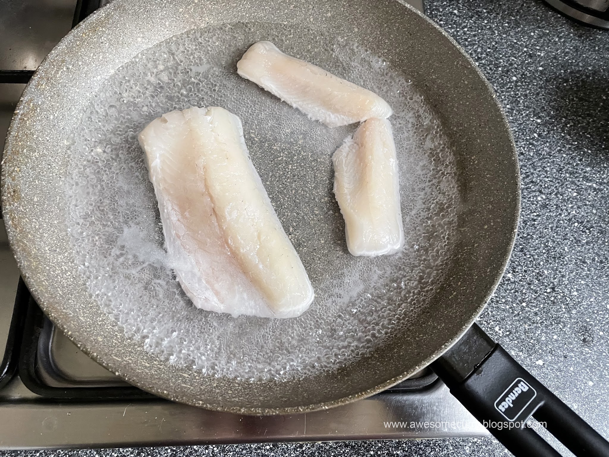 1. В небольшой сотейник наливаем воду и уксус, доводим до кипения, опускаем рыбу на 1-2 минуты, пока поверхность не станет матовой, после чего снимаем с огня, рыбу промываем, из сотейника воду выливаем.