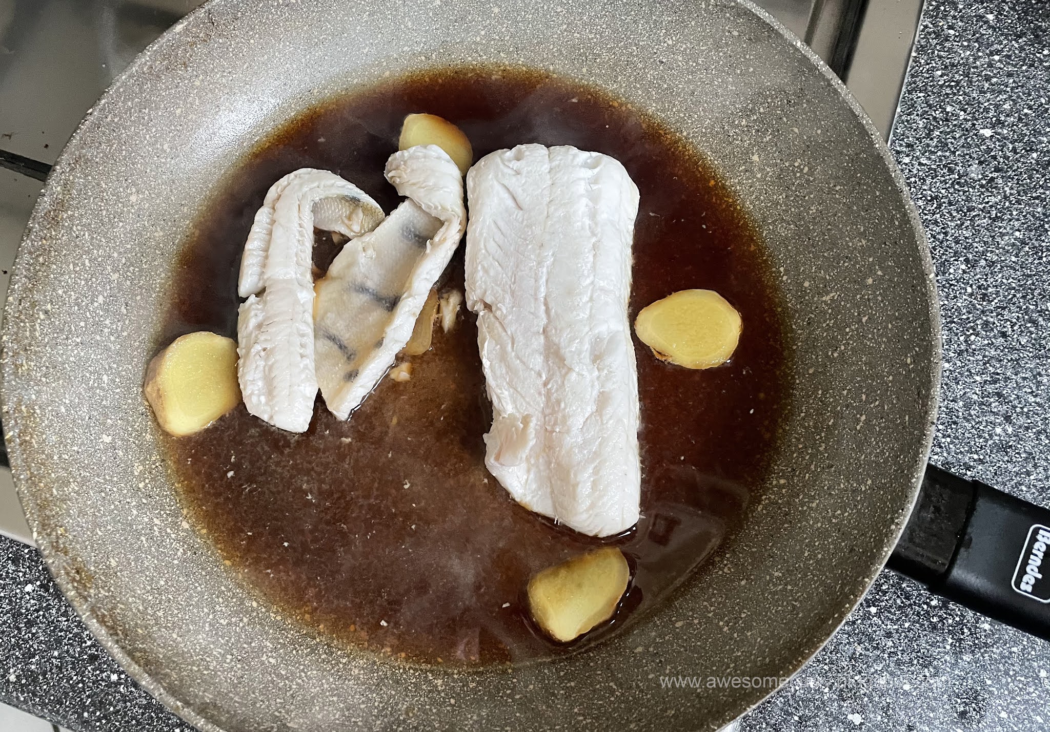 2. Теперь возвращаем нашу посуду на плиту, и отправляем туда сакэ, мирин, сахар, соевый соус и имбирь. Доводим до кипения, добавляем в сковородку рыбу, убираем огонь до минимума, накрываем все крышкой и тушим около 12 минут, следя, чтобы соус не выкипел до конца (можно добавить немного воды если это случится). В конце на сковороде должно остаться некоторое количество загустевшего и уварившегося соуса.