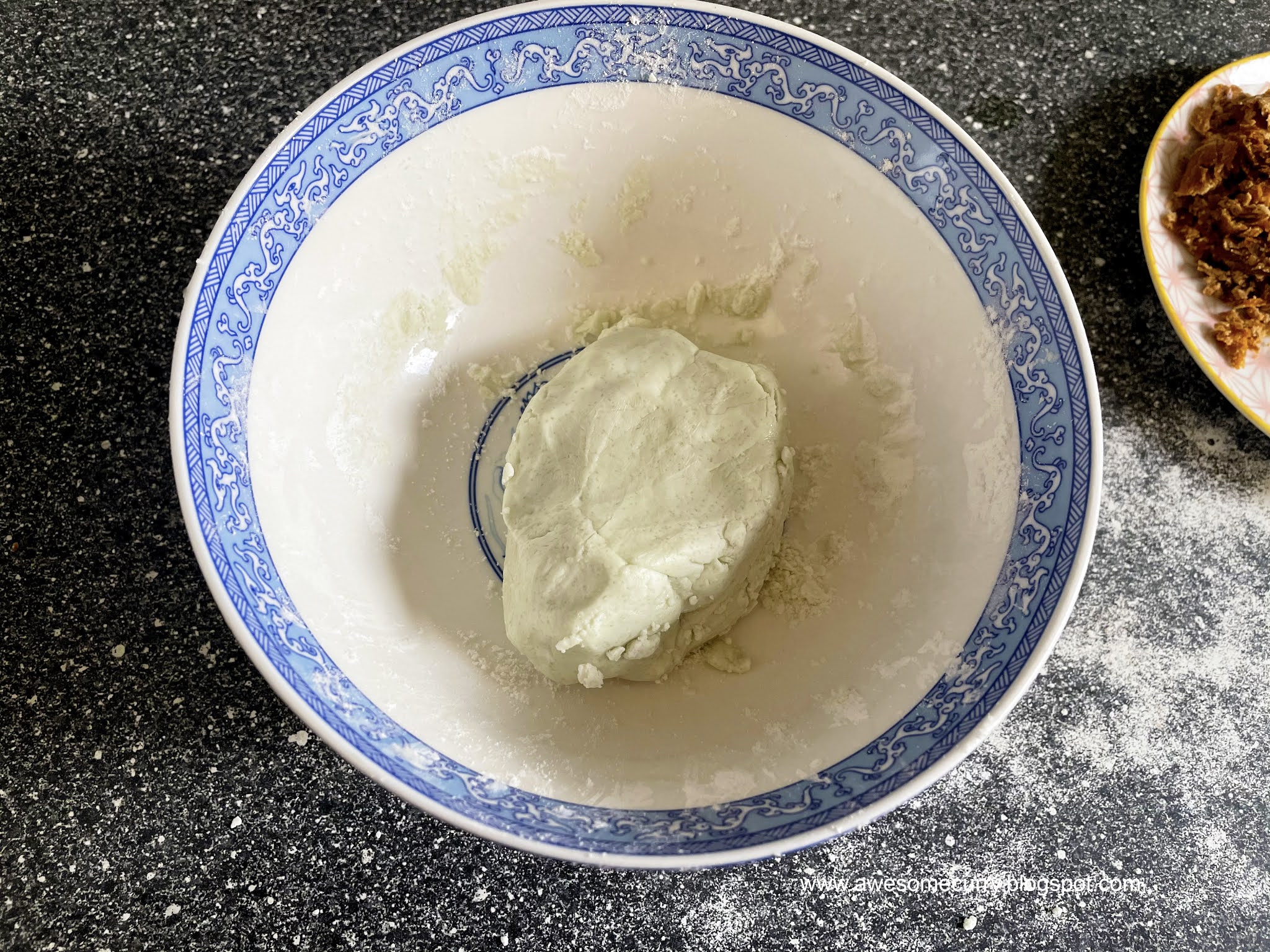 2. Смешайте крахмал или муку из тапиоки с мукой из клейкого риса и сахаром, после чего аккуратно введите в сухие ингредиенты экстракт листьев пандана, размешивайте до однородности, сформируйте гибкое мягкое тесто. Если нужно, можно добавить чуть больше муки.