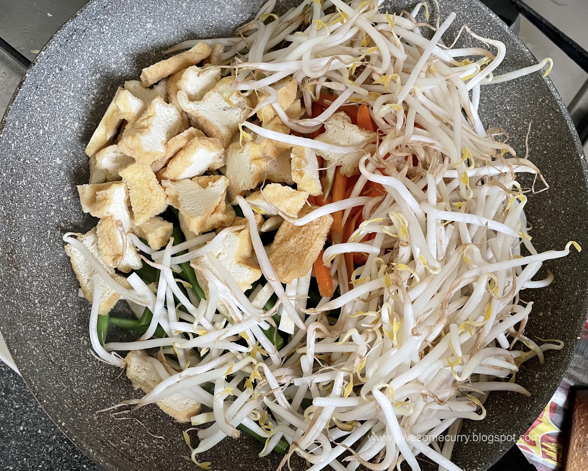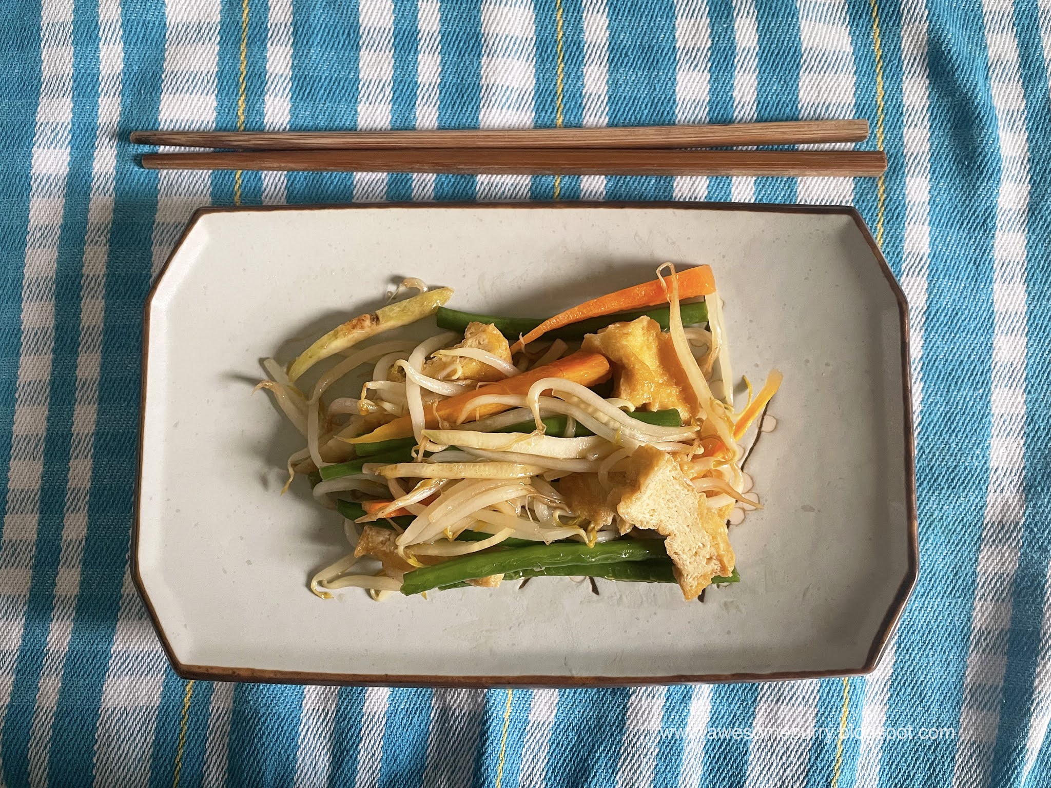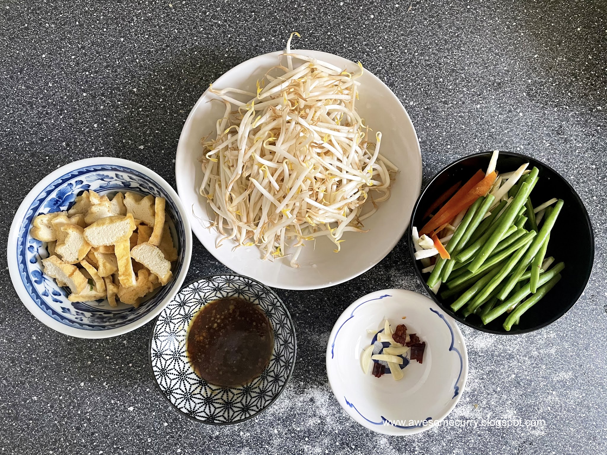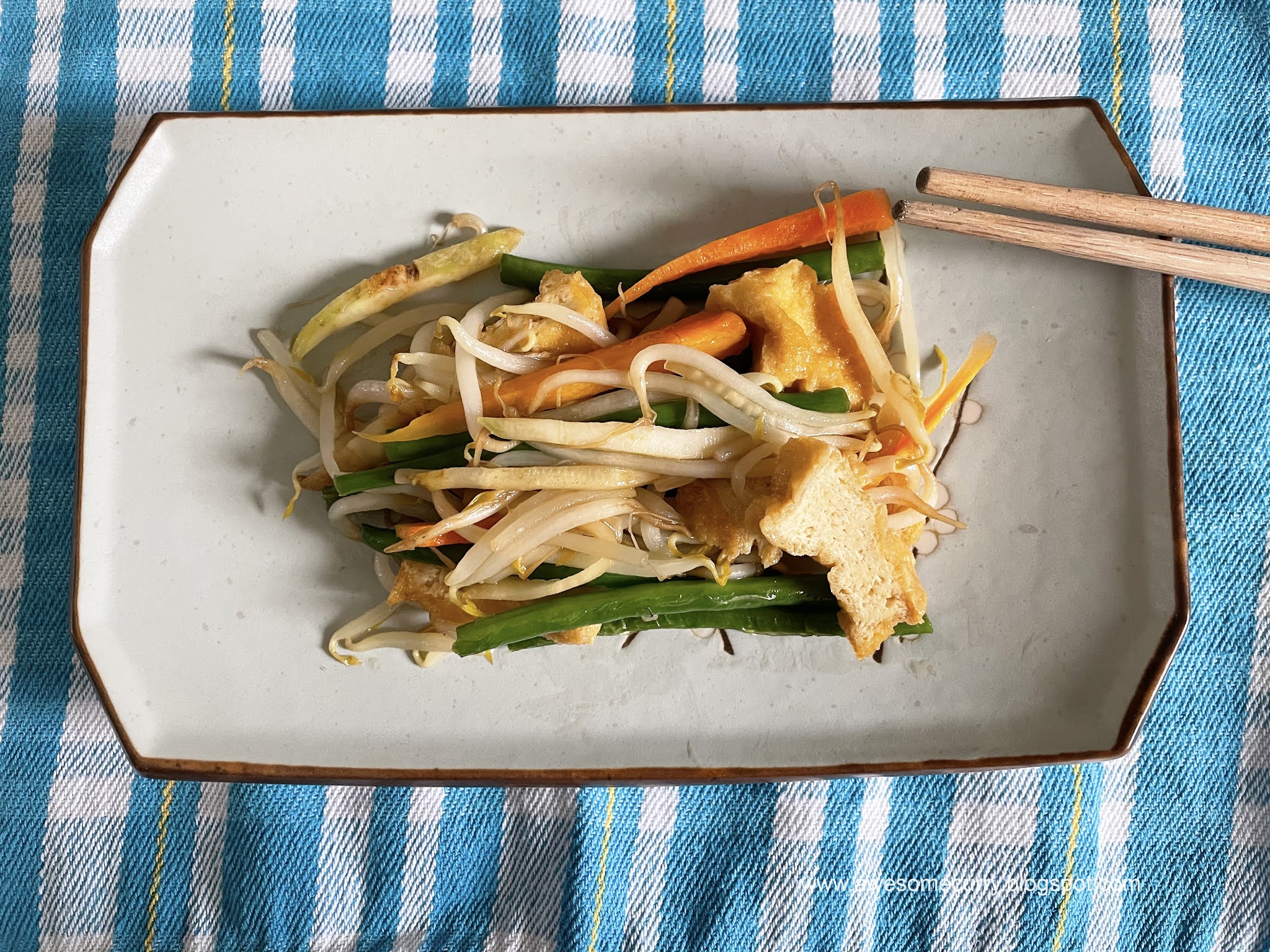 Жареный тофу Продается уже в готовом виде в азиатских супермаркетах в отделе с охлажденкой либо в замороженном виде. Для этого рецепта нарежьте его тонкими полосками. Также жареный тофу можно приготовить самим, для этого покупаем самый твердый тофу, можно еще и дать ему постоять под грузом какое-то время чтобы стекла жидкость, после чего жарим в большом количестве масла до золотистости. При нежелании возиться и недоступности готового ингредиента тофу можно исключить или заменить обычным твердым тофу и обжарить его вместе с остальными ингредиентами.