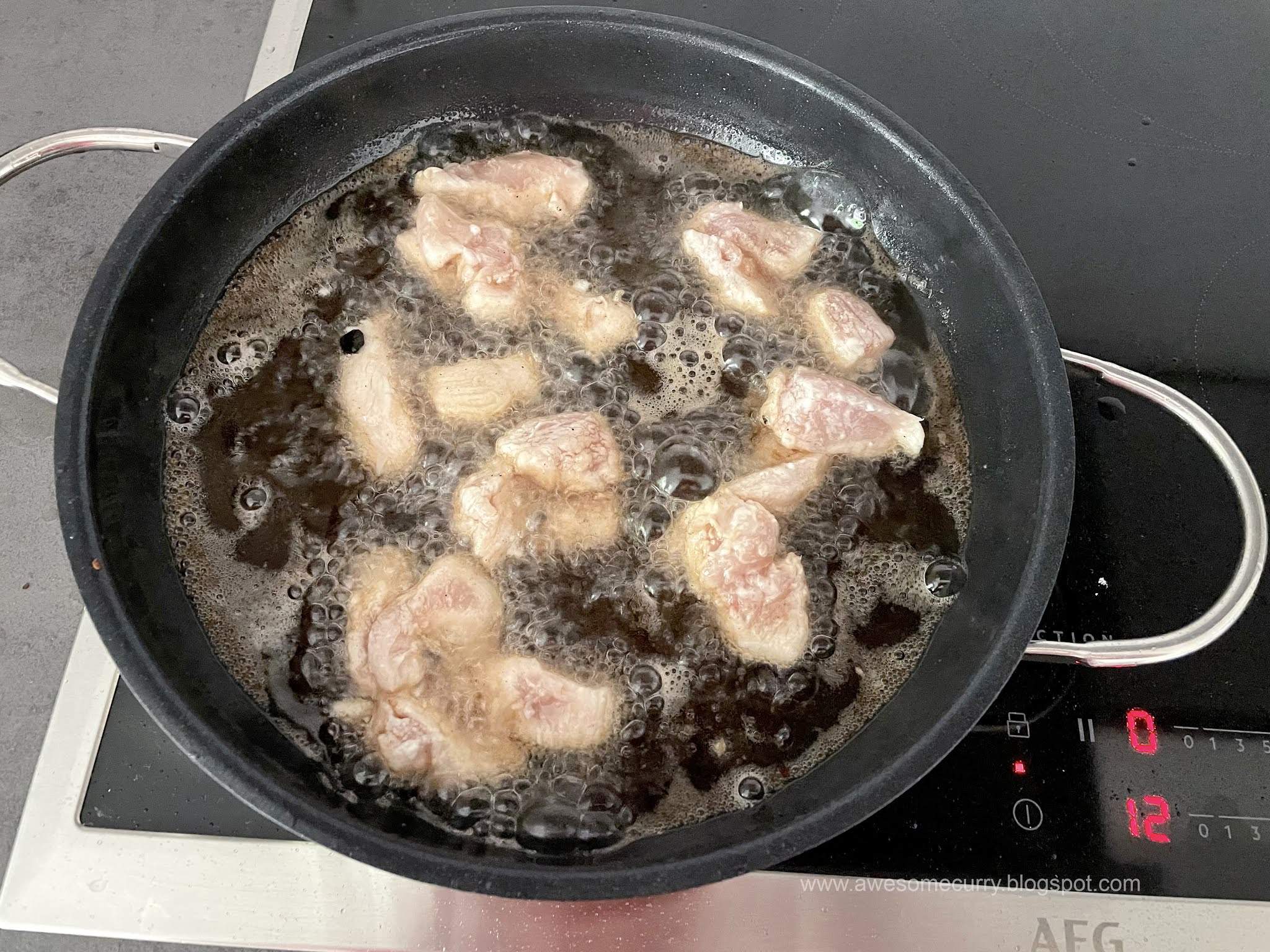 8. В масло отправляем курицу небольшими порциями, чтобы кусочкам было свободно. Каждую порцию курицы жарим примерно по 2 минуты с каждой стороны. Курица должна стать плотной при прикосновении лопаткой. В данном случае цвет не показатель, так как масло будет окрашенным после чили перцев и курица станет золотистой немного до того, как приготовится. Тем не менее, для небольших кусочков 2 минуты на сторону будет достаточно.