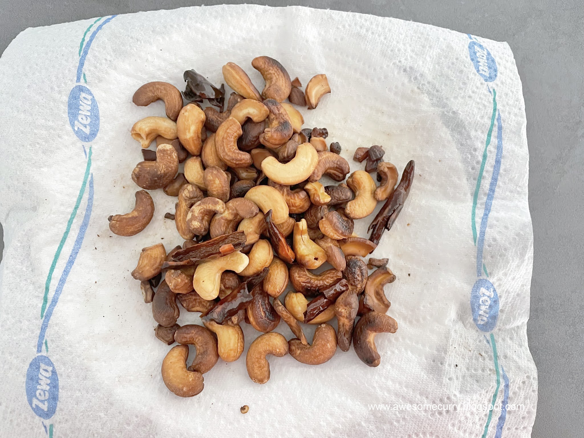 7. В сковороду с маслом отправляем чили перцы, жарим 30 секунд или даже меньше, пока они не дадут аромат и не станут немного темнее, сразу же вынимаем чтобы перчики не сгорели, отправляем на тарелку к кешью