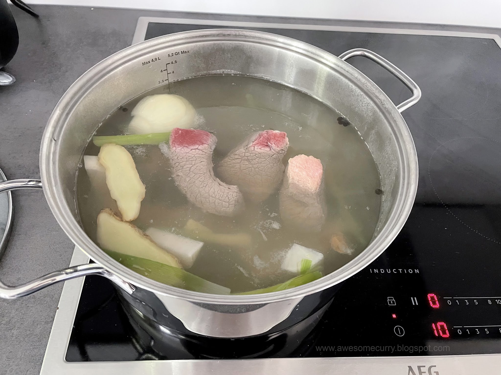 2. В кастрюлю отправляем лук, белые части порея, редьку, имбирь, чеснок и черный перец. Заливаем двумя литрами воды, доводим до кипения и готовим на среднем огне под крышкой еще 5 минут
