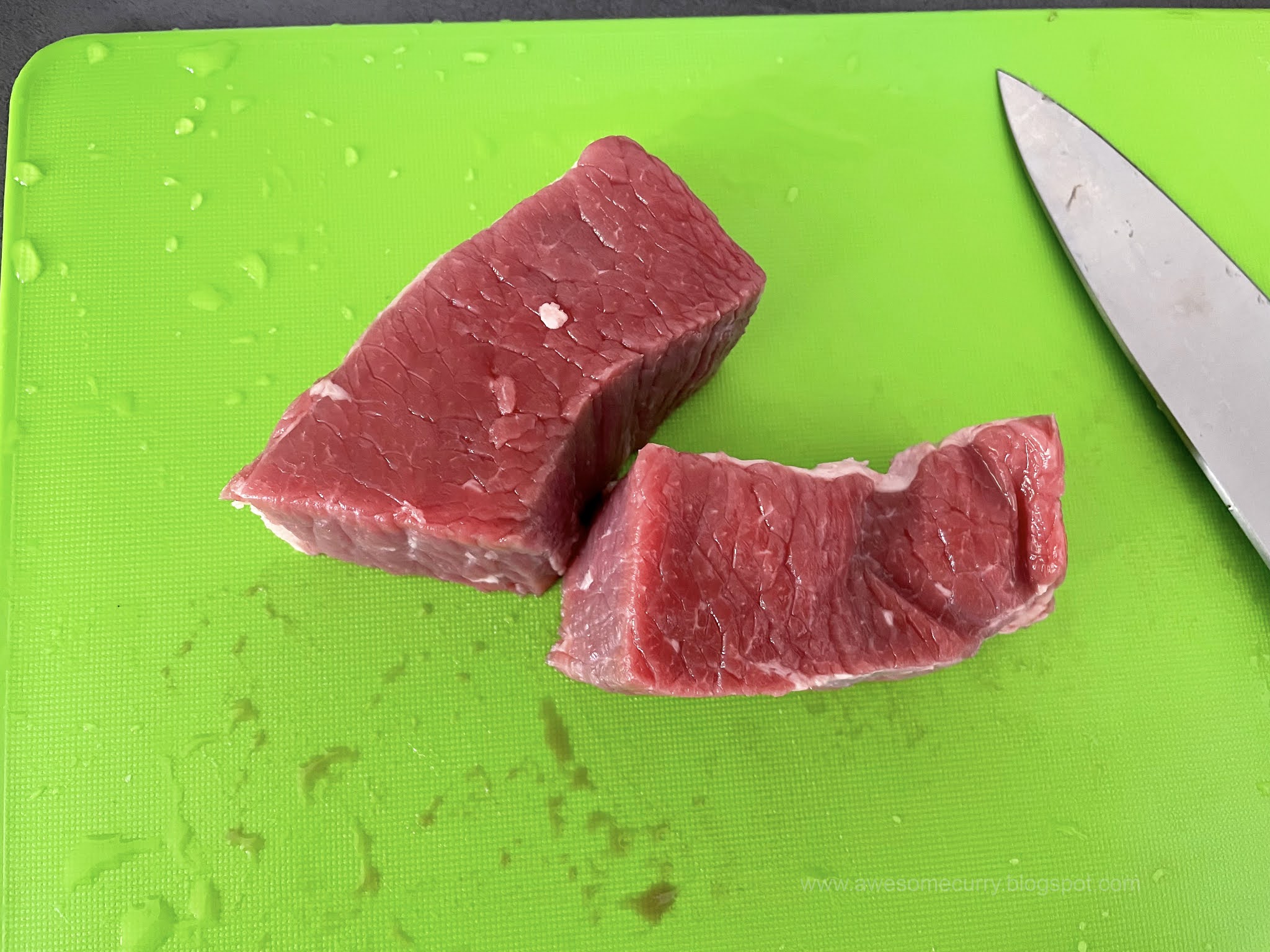 1. Нарезаем говядину поперек на кусочки толщиной около 5 см