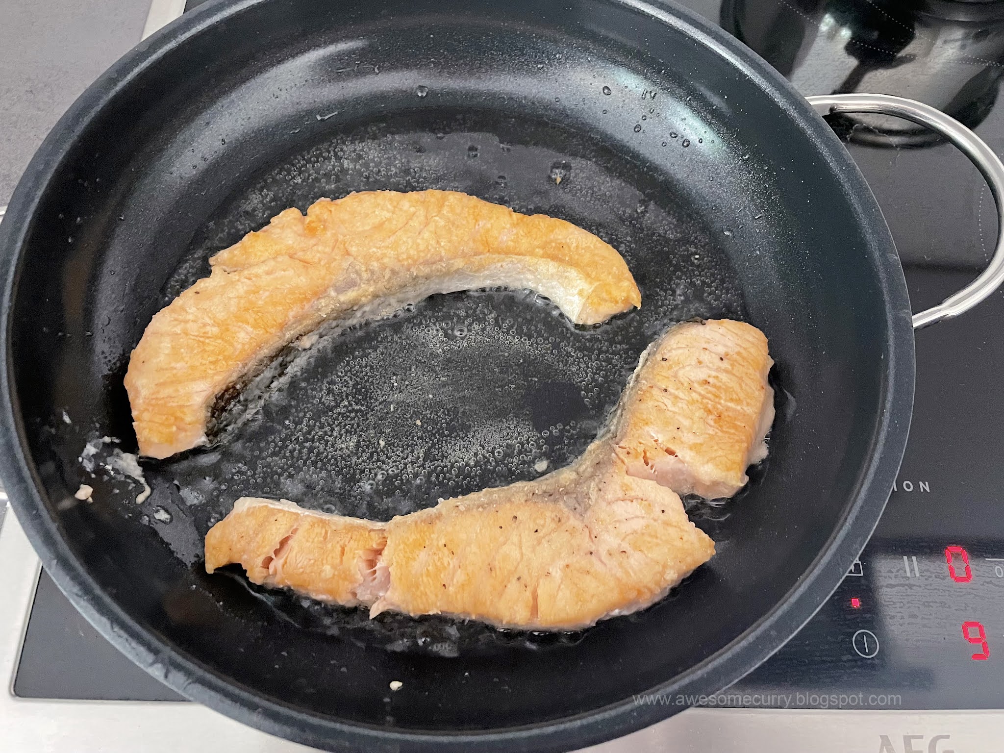3. Отправьте в сковороду лосося кожей вниз, готовьте на среднем огне около 4 минут или пока кожа не приобретет золотистый оттенок, переверните и готовьте еще минуты 3 с другой стороны