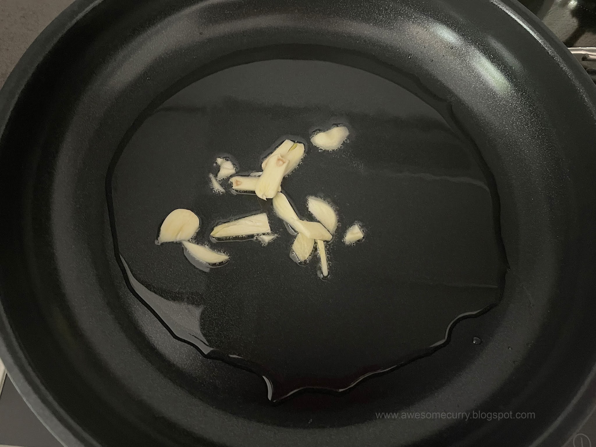 2. Нагрейте в сковороде растительное масло, обжарьте пластинки чеснока на среднем огне в течение минут двух, пока они не дадут запах, после чего выньте чеснок – он свою роль уже сыграл