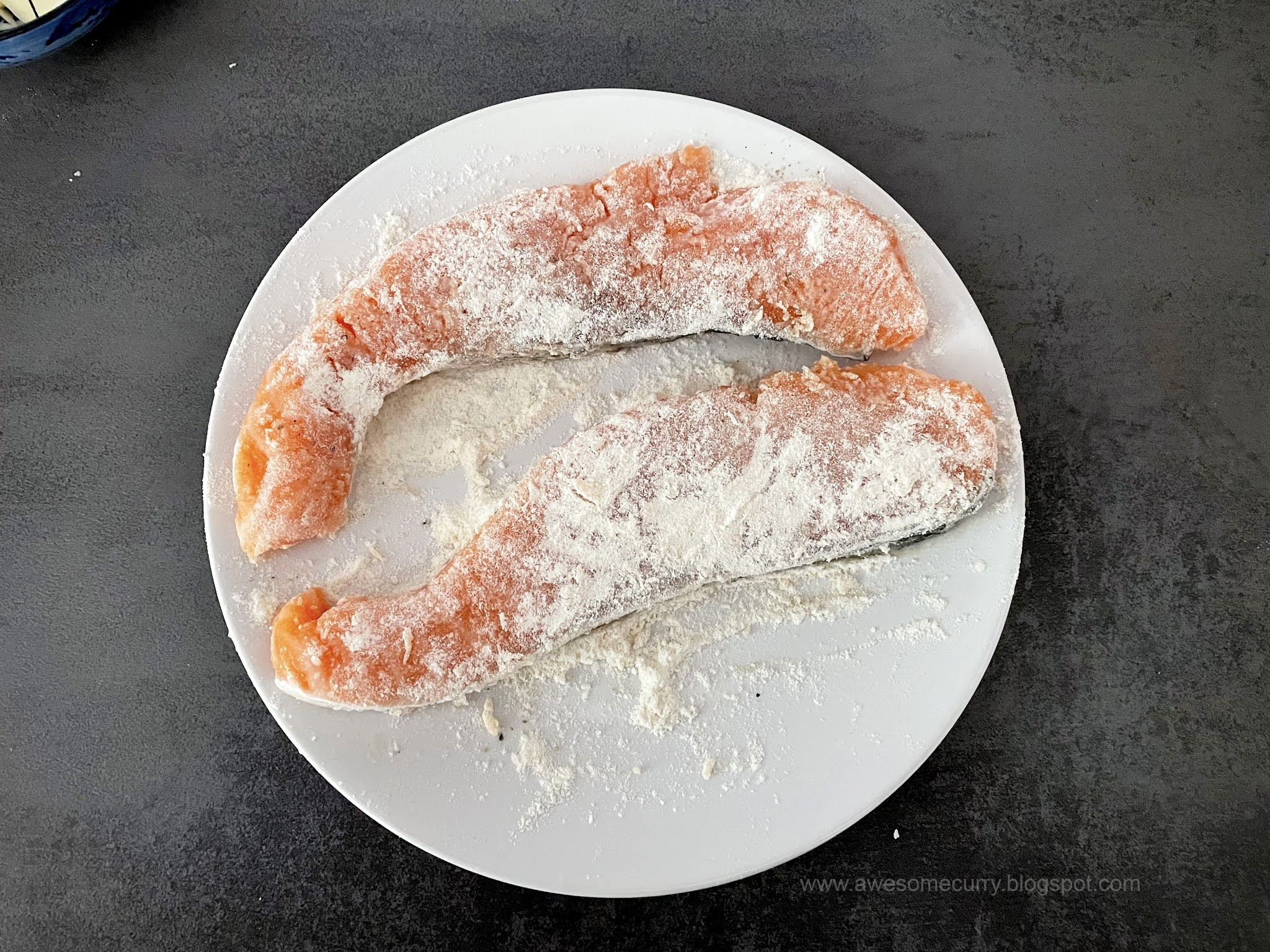 1. Посыпьте филе рыбы черным перцем и немного солью (учитывайте что соус тоже содержит соль, но ее не совсем достаточно) и обваляйте в муке