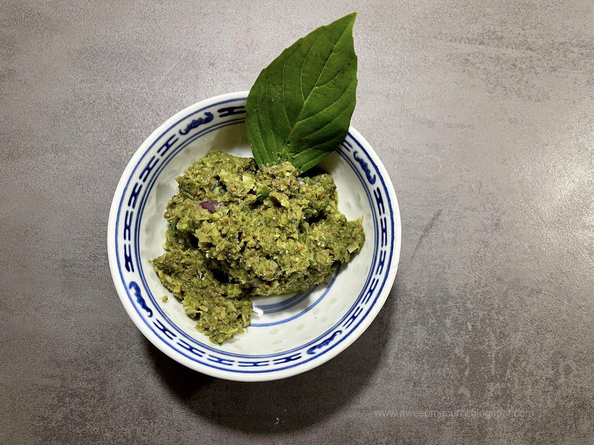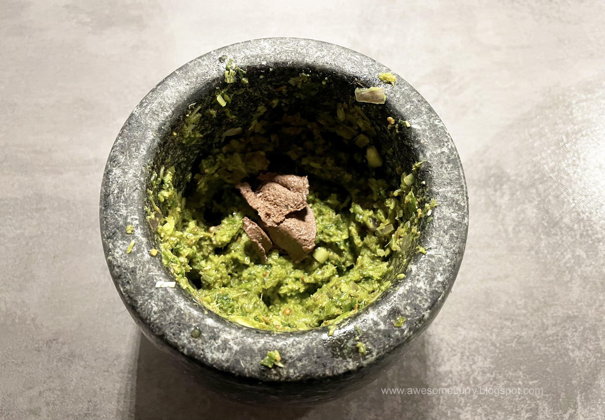 3. В ступку отправляем соль и зеленые чили перцы, измельчаем, добавляем листья базилика и снова измельчаем до почти гладкости. Если в процессе начнет казаться, что в ступке слишком много жидкости, можно добавить предварительно заготовленных сухих специй.