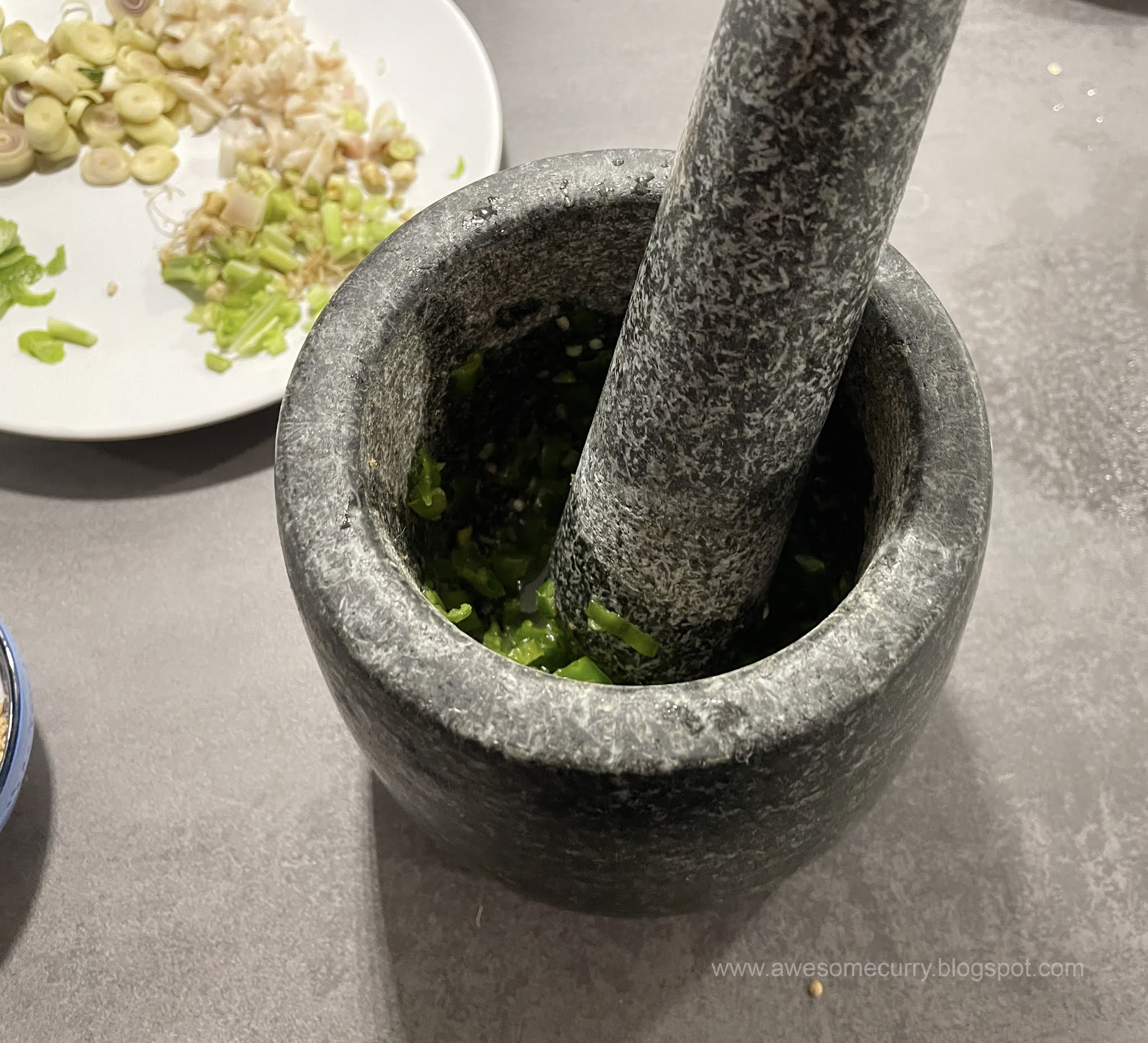 Для приготовления карри пасты нужно использовать либо тайскую каменную ступку, либо очень мощный кухонный комбайн. Обычный блендер не даст нужную гладкую консистенцию, но его можно использовать в конце приготовления: сначала хорошо подавить перцы, лук, чеснок и листья в ступке, и уже после смешивания всех ингредиентов пробивать пасту блендером для дополнительной гладкости.